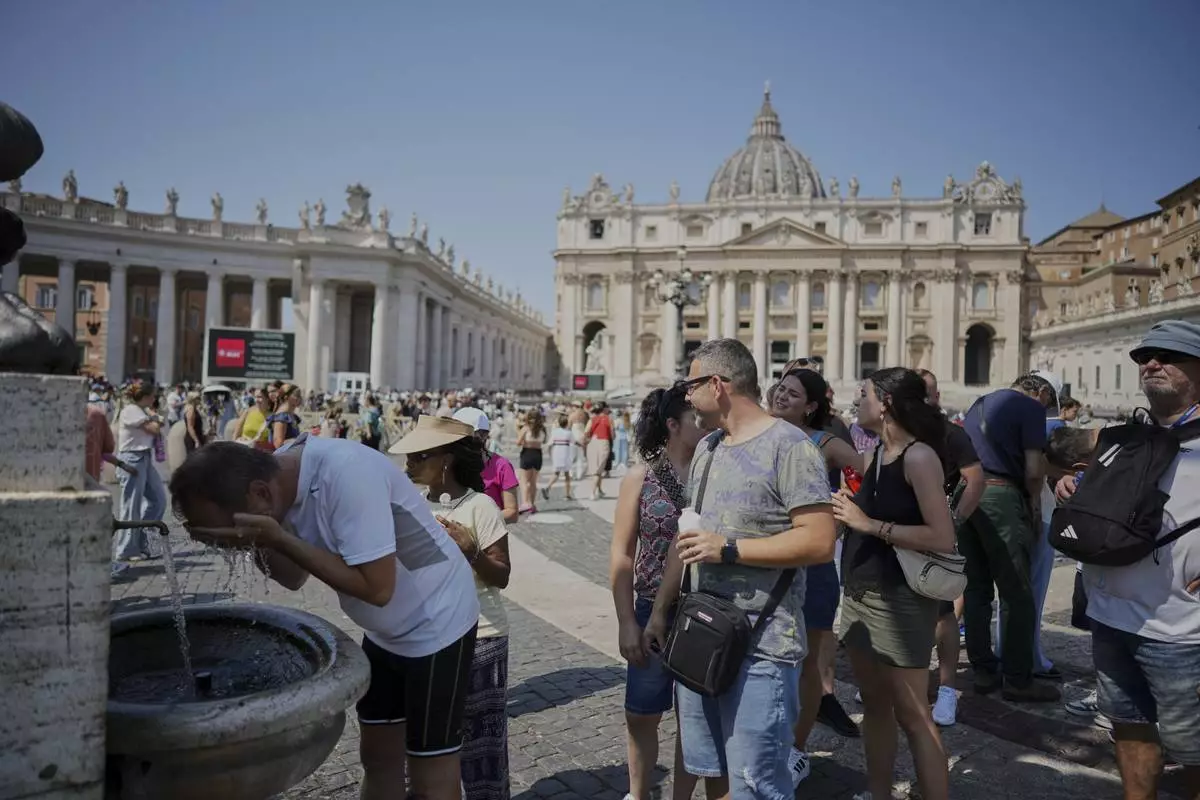 People refresh at a fountain in St.Peter's Square, at the Vatican, Sunday, Aug. 10, 2025. (AP Photo/Andrew Medichini)