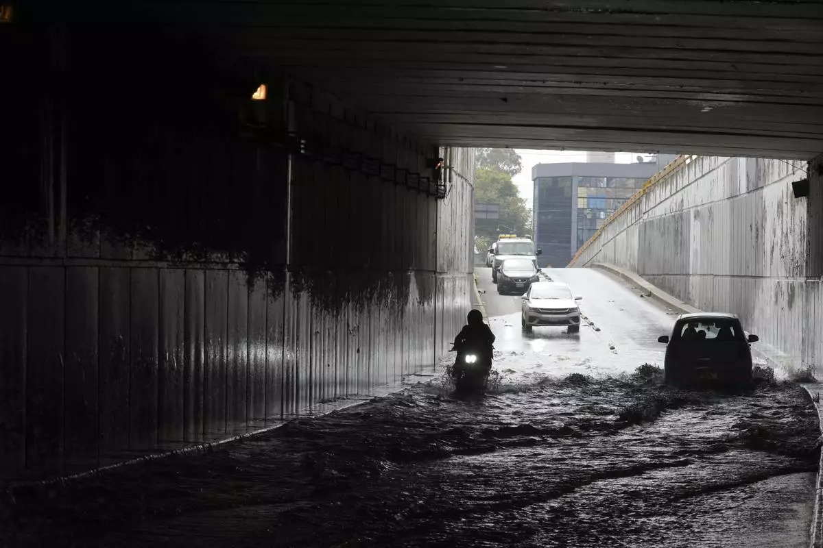 Drivers cross a flooded street just outside the Benito Juárez International airport in Mexico City, Tuesday, Aug. 12, 2025. (AP Photo/Fernando Llano)