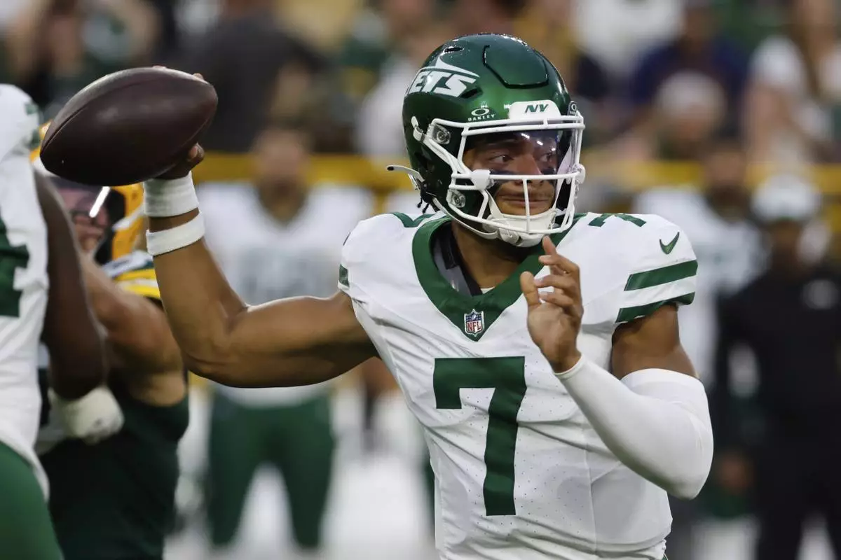 New York Jets' Justin Fields thorws during the first half of a preseason NFL football game against the Green Bay Packers Saturday, Aug. 9, 2025, in Green Bay, Wis. (AP Photo/Mike Roemer)