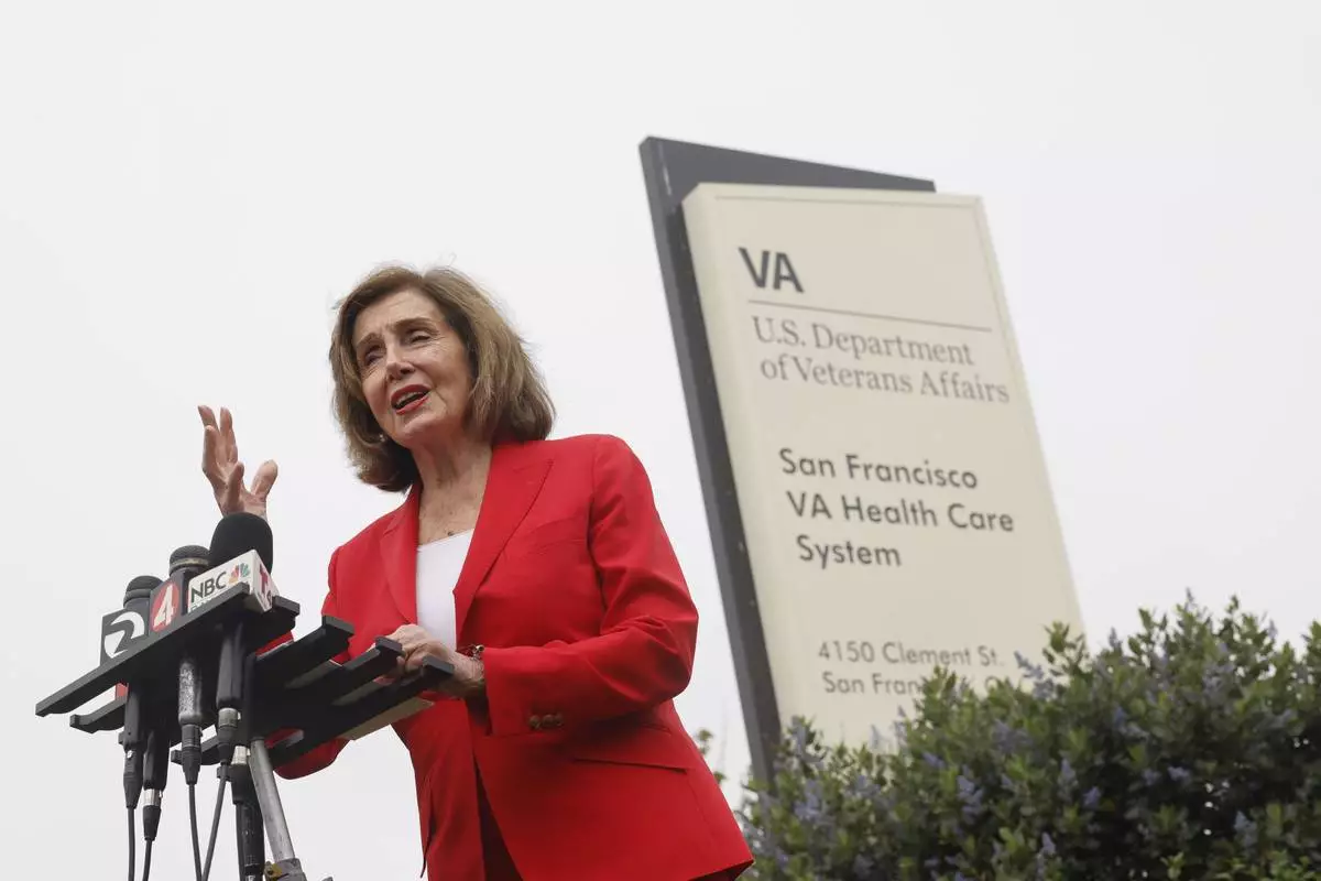 Democratic Rep. Nancy Pelosi speaks on the corner of Clement Street and 42nd Avenue after touring the San Francisco VA Medical Center and meeting VA officials to mark House Democrats' Honor Our Veterans Day of Action on Thursday, Aug. 7, 2025, in San Francisco. (Lea Suzuki/San Francisco Chronicle via AP)
