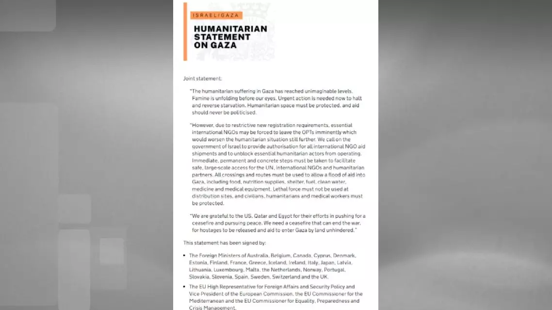 The ministers urged the Israeli government to authorize all international non-governmental organization aid shipments and to allow essential humanitarian actors to operate in the embattled enclave. "All crossings and routes must be used to allow a flood of aid into Gaza, including food, nutrition supplies, shelter, fuel, clean water, medicine, and medical equipment," the statement said.