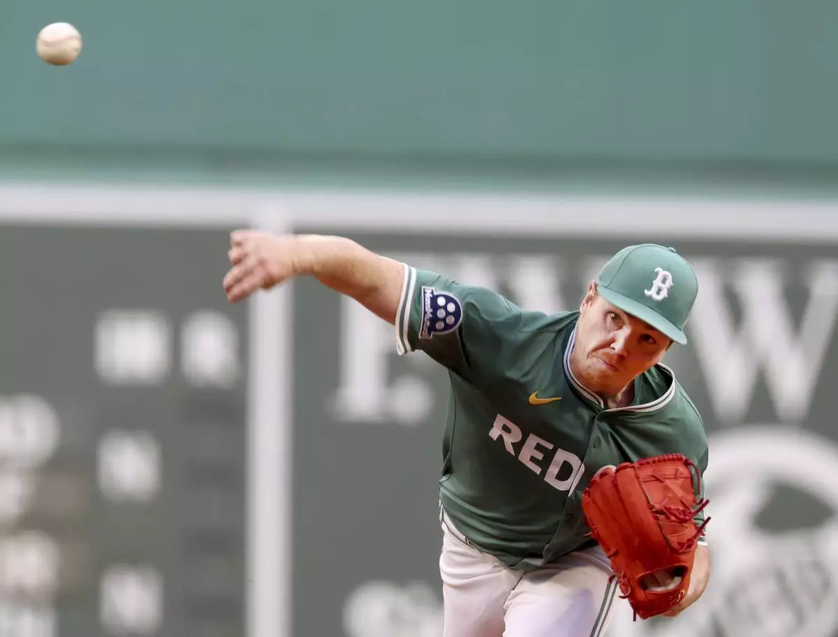 FILE - Boston Red Sox pitcher Hunter Dobbins throws during the first inning of a baseball game against the Tampa Bay Rays, July 11, 2025, in Boston. (AP Photo/Mark Stockwell, File)