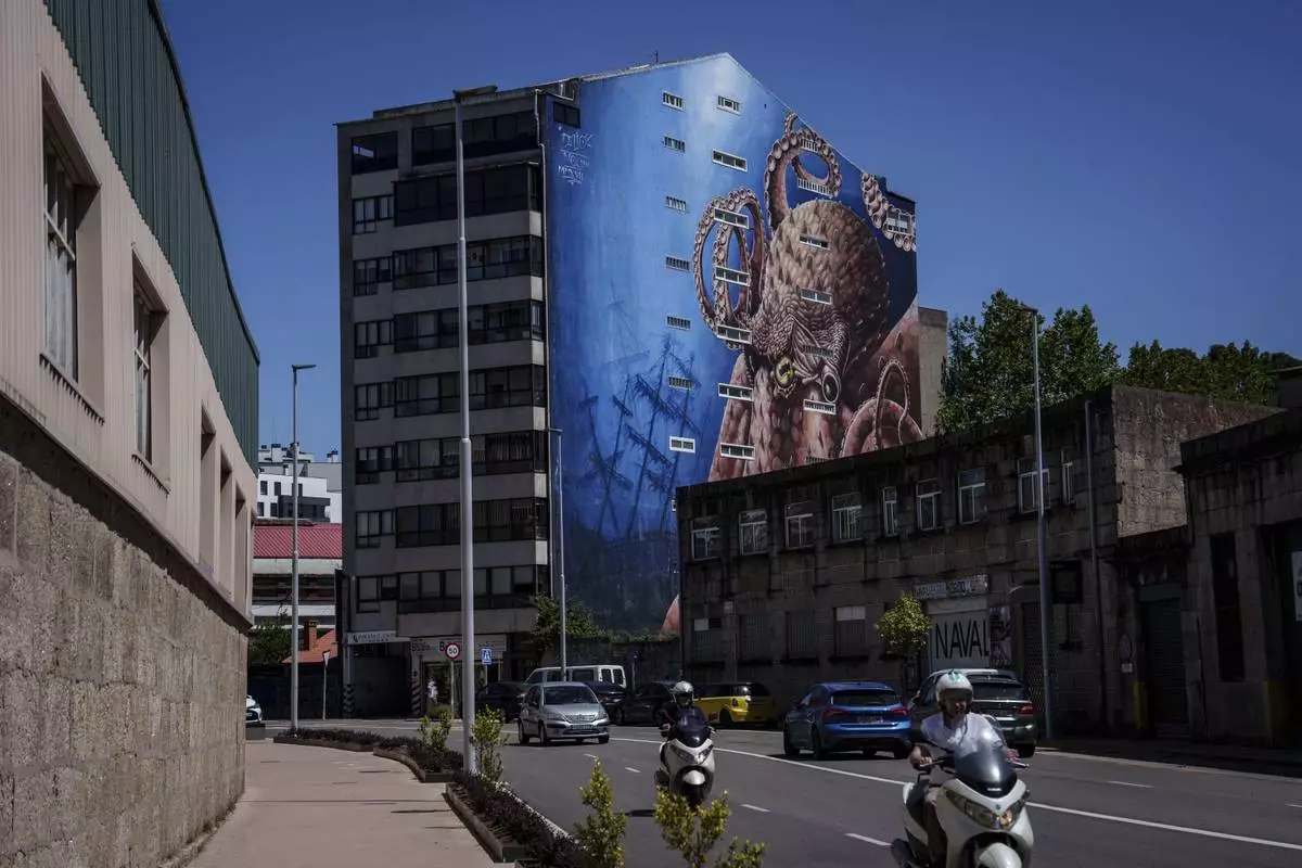 Vehicles move down a street with an octopus mural in the background Thursday, June 26, 2025, in Vigo, Spain. (AP Photo/Annika Hammerschlag)