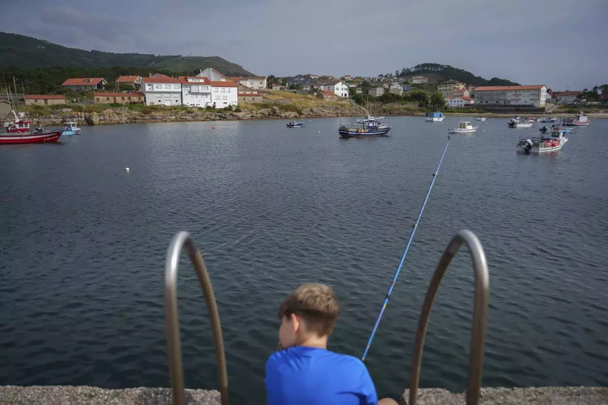 A young boy waits to catch a fish Tuesday, June 24, 2025, in Lira, Spain. (AP Photo/Annika Hammerschlag).