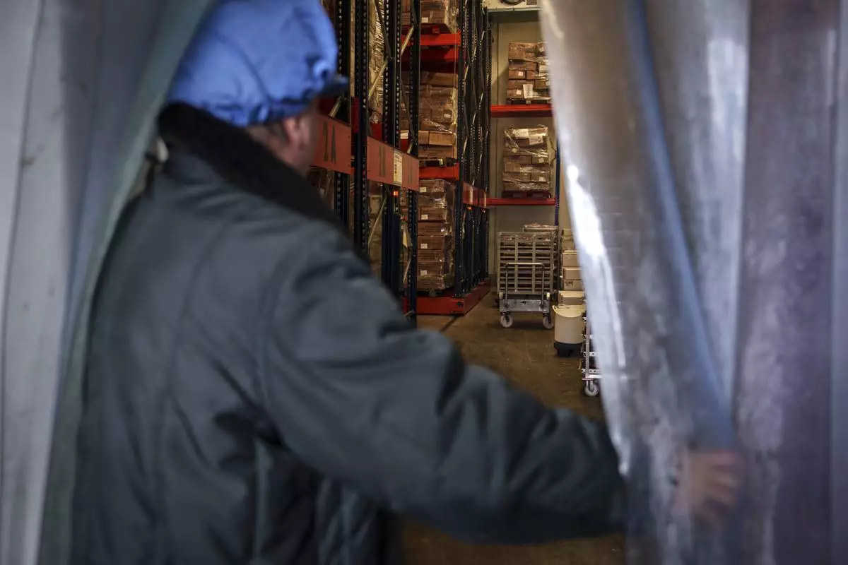 Frozen octopuses imported from Morocco and Mauritania are stored at Frigorificos Arcos SL on Wednesday, June 25, 2025, in O Carballino, Spain. (AP Photo/Annika Hammerschlag)