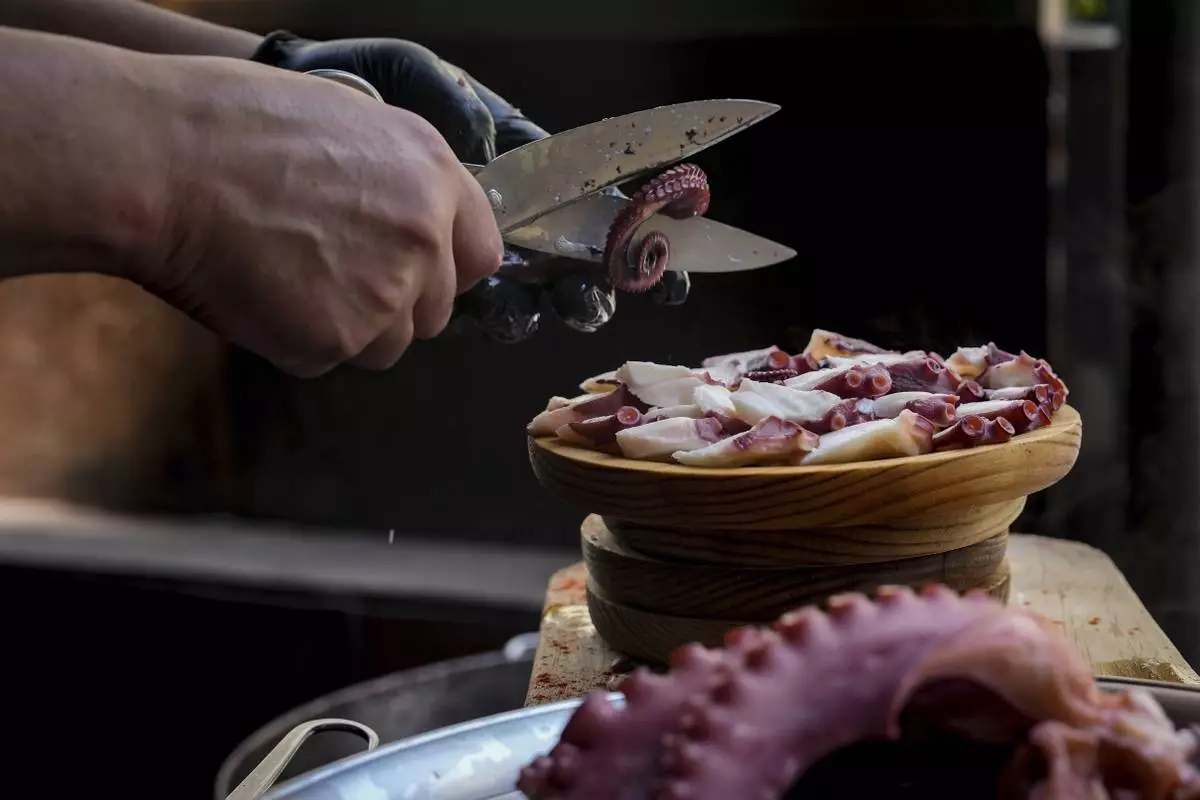 Octopus is prepared at a restaurant on Wednesday, June 25, 2025, in O Carballino, Spain. (AP Photo/Annika Hammerschlag)