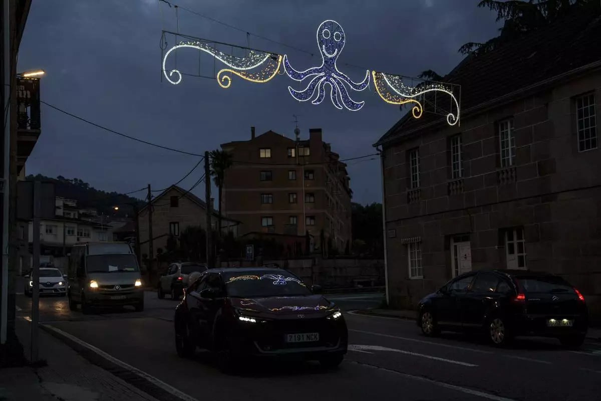 Lights with likeness of an octopus is illuminated over a street Tuesday, June 24, 2025, in Pontevedra, Spain. (AP Photo/Annika Hammerschlag)