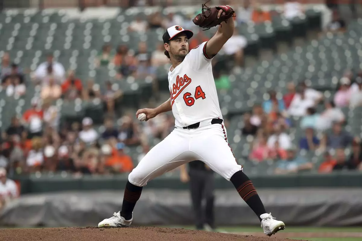 Baltimore Orioles pitcher Dean Kremer throws during the first inning of a baseball game against the Seattle Mariners, Tuesday, Aug. 12, 2025, in Baltimore. (AP Photo/Daniel Kucin Jr.)
