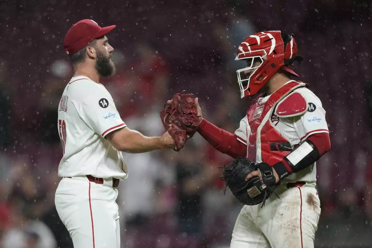 Cincinnati Reds pitcher Sam Moll, left, and Cincinnati Reds catcher Jose Trevino celebrate after winning a baseball game against the Philadelphia Phillies Tuesday, Aug. 12, 2025, in Cincinnati. (AP Photo/Carolyn Kaster)