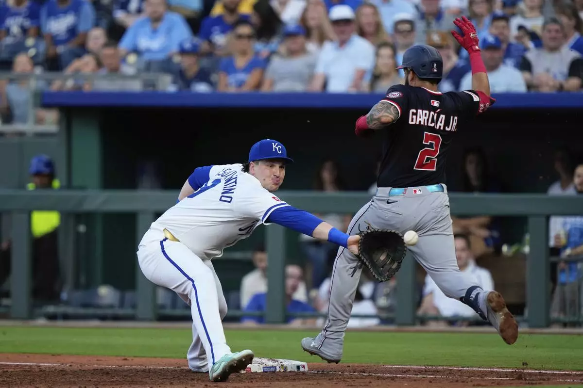 Washington Nationals' Luis Garcia Jr. (2) is out at first by Kansas City Royals first baseman Vinnie Pasquantino after bunting during the third inning of a baseball game, Tuesday, Aug. 12, 2025, in Kansas City, Mo. (AP Photo/Charlie Riedel)