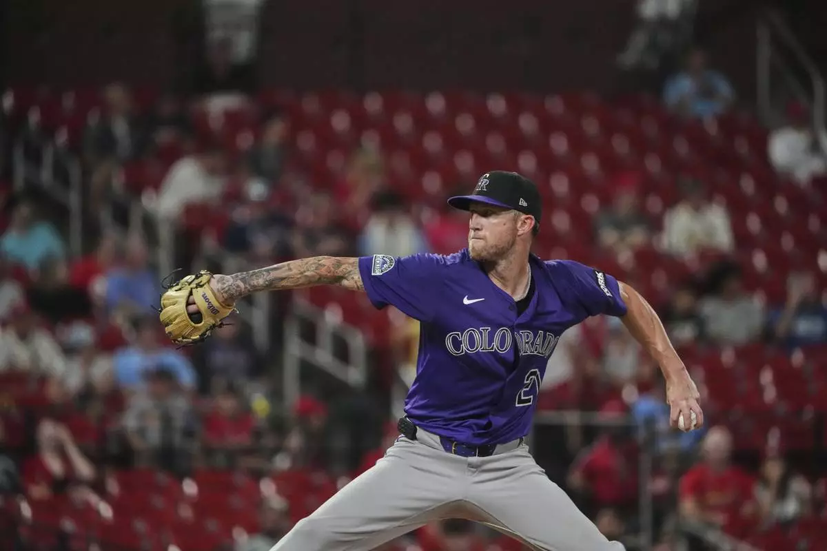 Colorado Rockies starting pitcher Kyle Freeland throws during the seventh inning of a baseball game against the St. Louis Cardinals Tuesday, Aug. 12, 2025, in St. Louis. (AP Photo/Jeff Roberson)