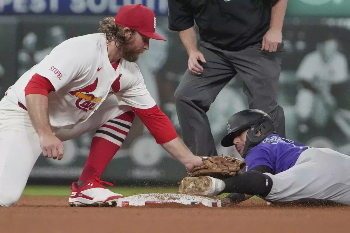 Colorado Rockies' Tyler Freeman, right, is out as he slides past the bag while trying to steal second as St. Louis Cardinals second baseman Brendan Donovan makes the tag during the fourth inning of a baseball game Tuesday, Aug. 12, 2025, in St. Louis. (AP Photo/Jeff Roberson)