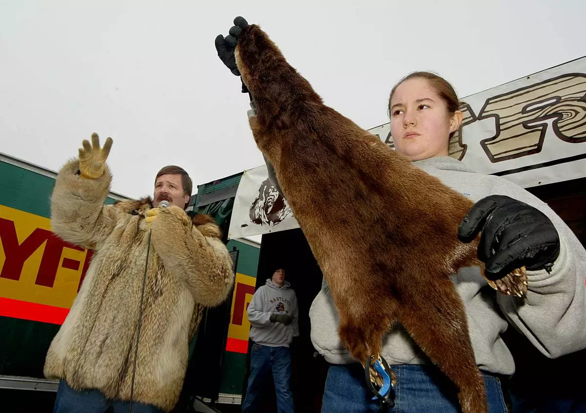 FILE - Gloriella Curtis holds up a river otter hide as Steve Childs calls off the bids during the Fur Rendezvous annual auction in Anchorage, Alaska, Feb. 29, 2004. (AP Photo/Al Grillo, File)