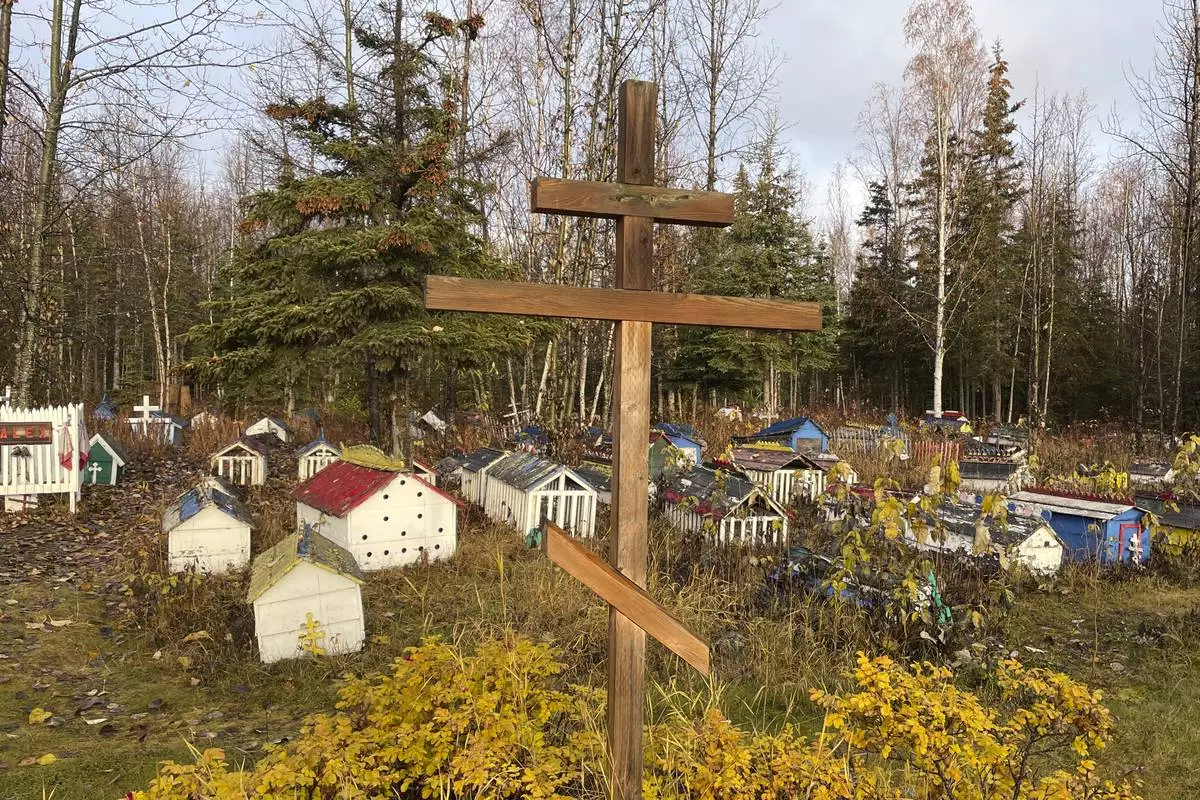 FILE - The cemetery at St. Nicholas Church in Eklutna, Alaska, features a mixture of Russian Orthodox conventions like crosses featuring three cross beams and the Dena'ina Athabascan tradition of erecting spirit homes above the graves, on Oct. 13, 2023. (AP Photo/Mark Thiessen, File)