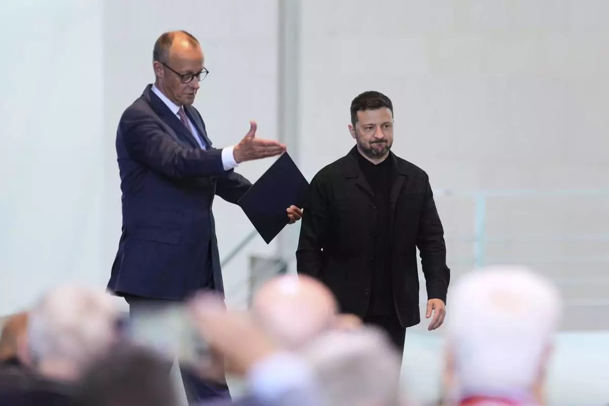 FILE -Germany's Chancellor Friedrich Merz, left, and Ukraine's President Volodymyr Zelenskyy arrive for a news conference at the chancellery in Berlin, Germany, May 28, 2025.(AP Photo/Markus Schreiber, File)