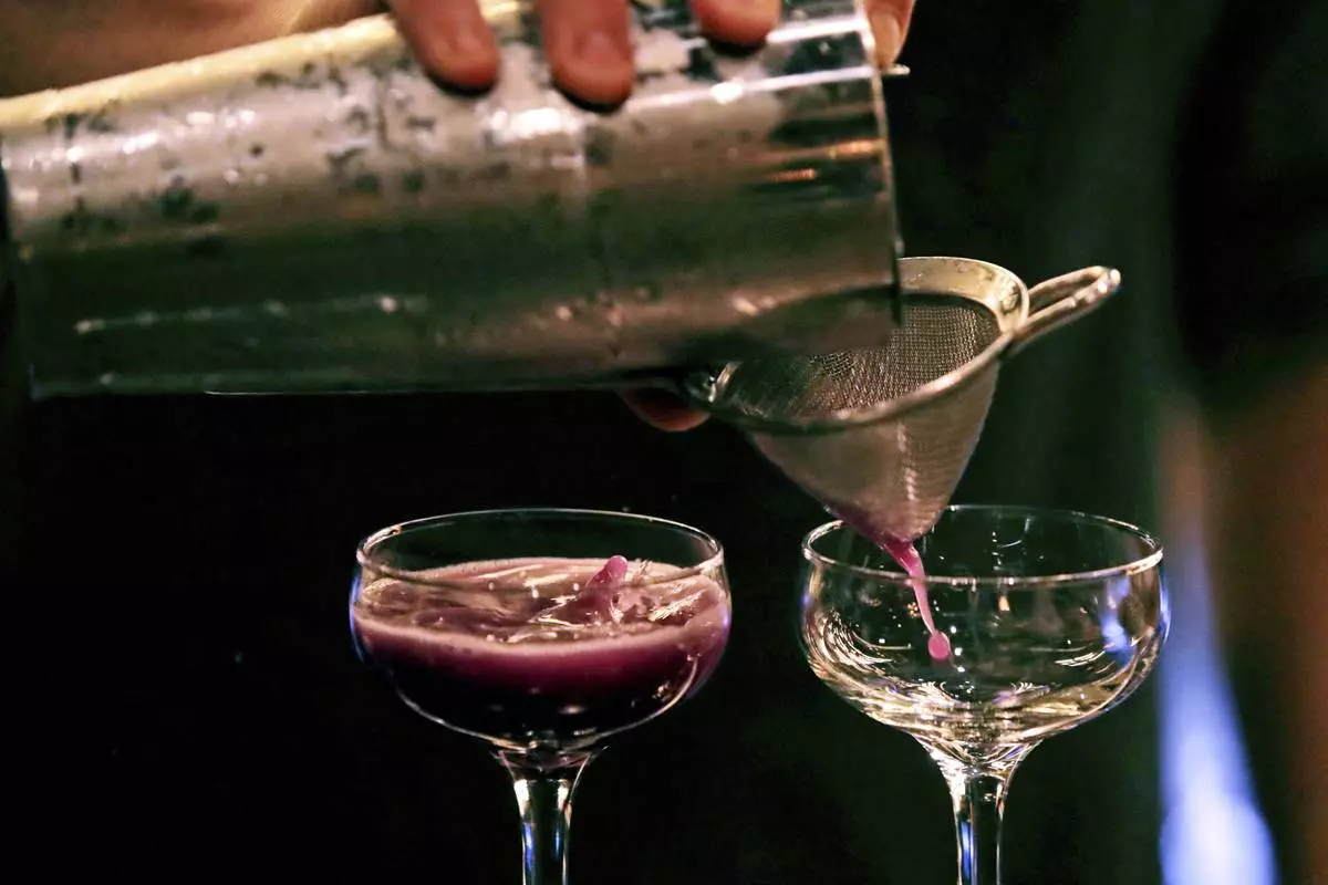 FILE - A bartender pours a cocktail in Dec. 10, 2019, in Boston. (AP Photo/Charles Krupa, File)