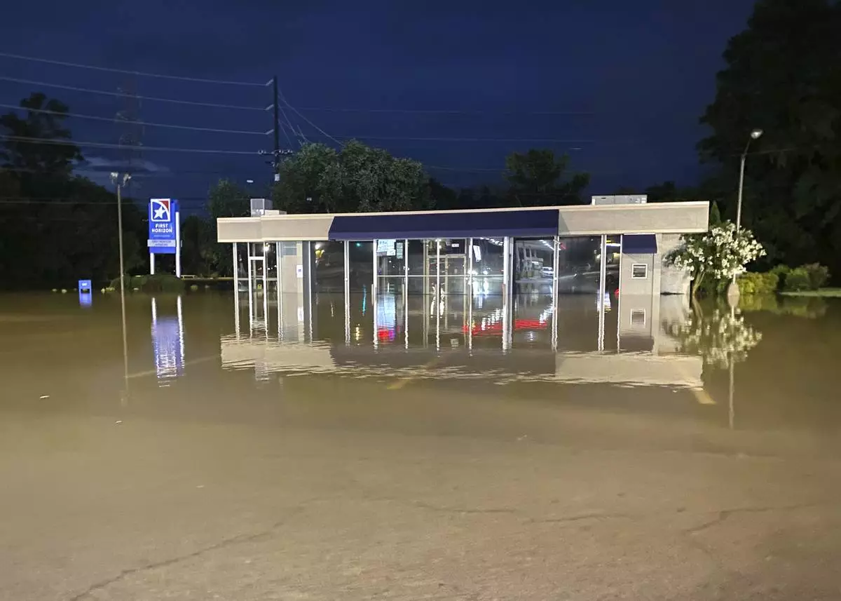 The East Brainerd branch of First Horizon Bank is flooded by the waters of Mackey Branch, in Chattanooga, Tenn., on Aug. 12, 2025. (Robin Rudd/Chattanooga Times Free Press via AP)