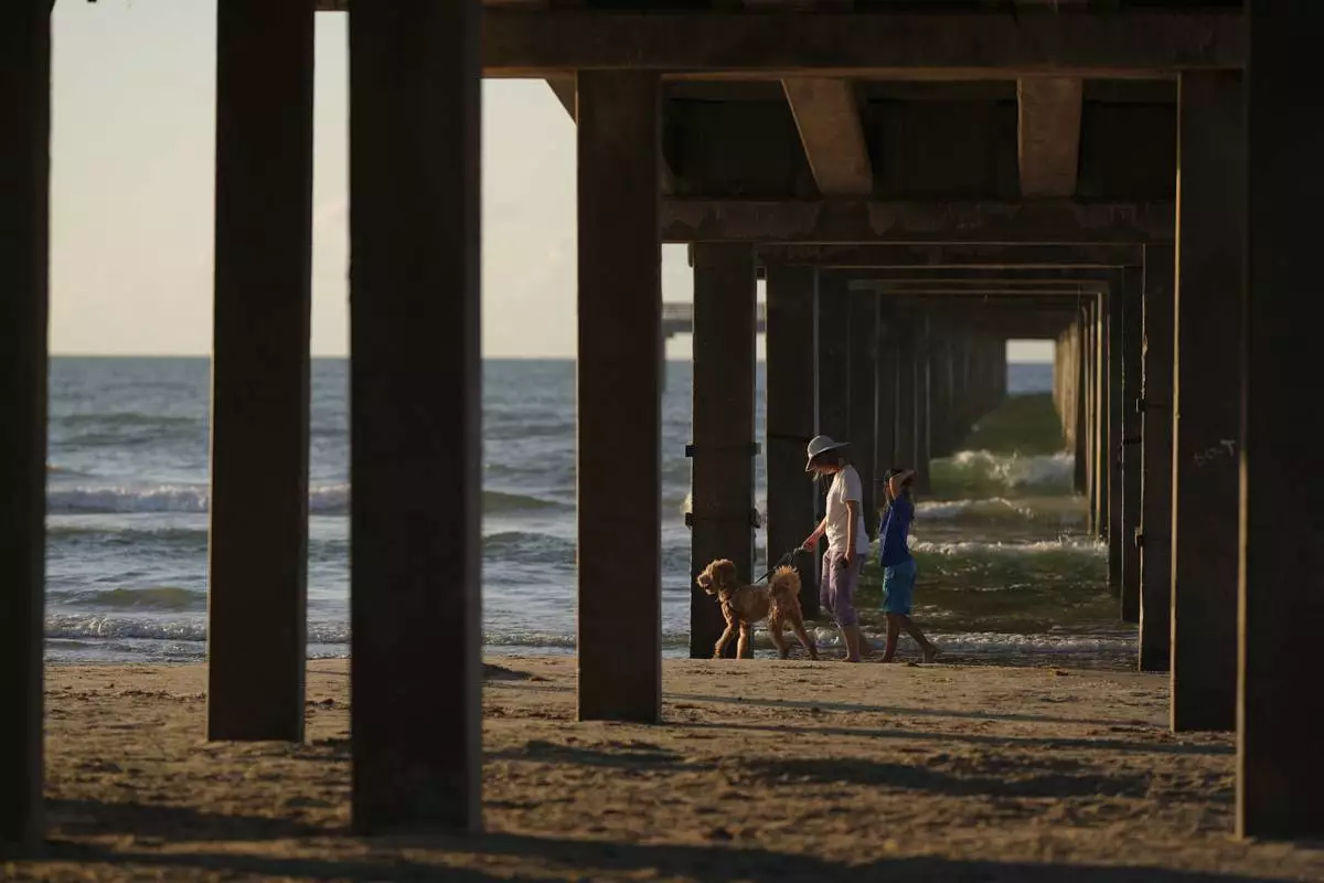 FILE - A woman walks her dog along the beach as the sun rises in Port Aransas, Aug. 12, 2025. (AP Photo/Eric Gay, File)