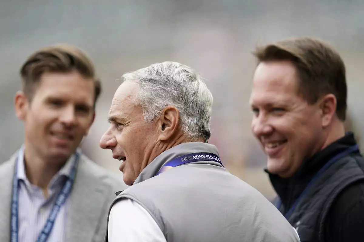 FILE - MLB Commissioner Rob Manfred, center, talks with Minnesota Twins executive vice president Joe Pohlad, left, and Twins president of baseball operations Derek Falvey before Game 2 of an AL wild-card baseball playoff series between the Twins and the Toronto Blue Jays Wednesday, Oct. 4, 2023, in Minneapolis. (AP Photo/Abbie Parr, File)