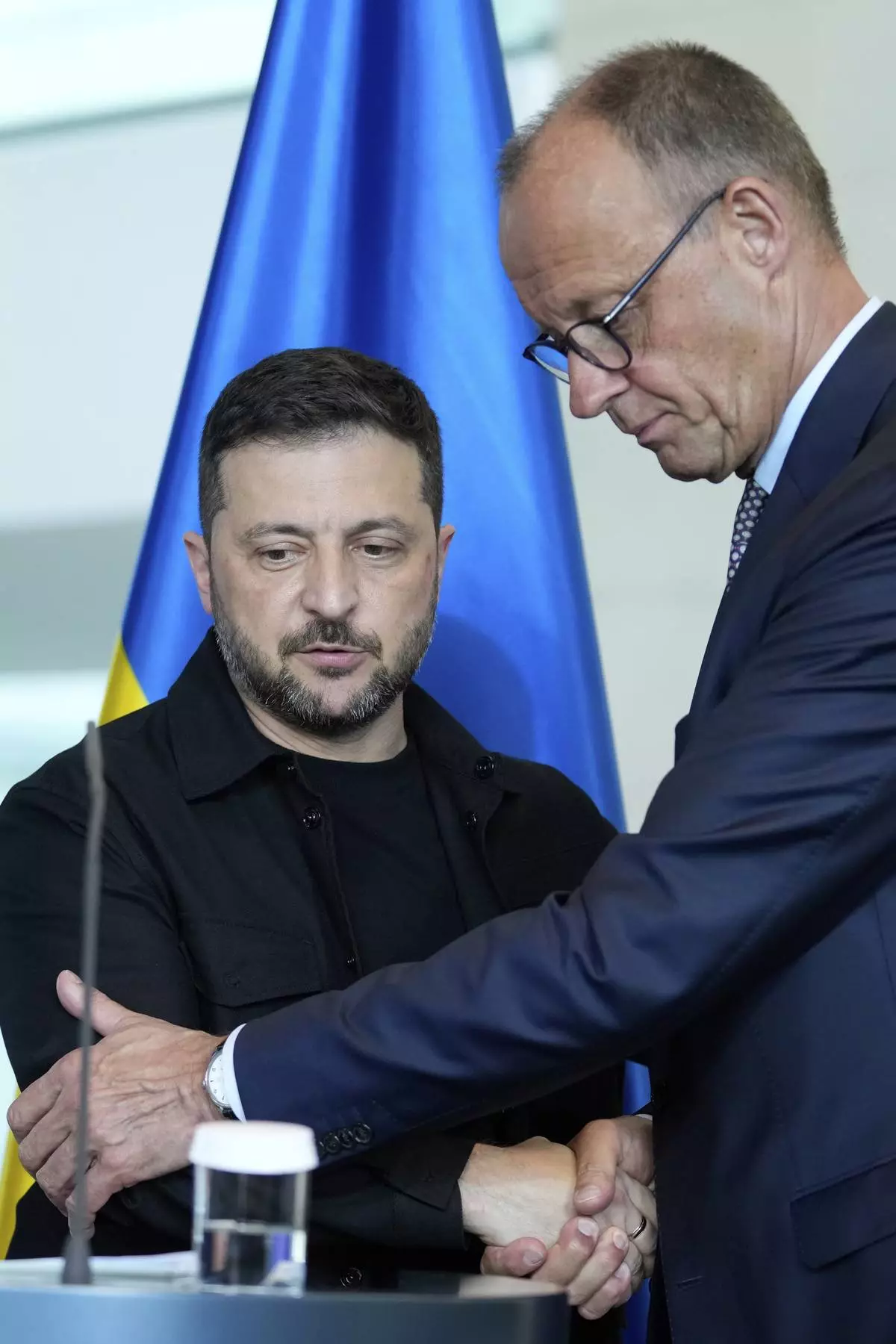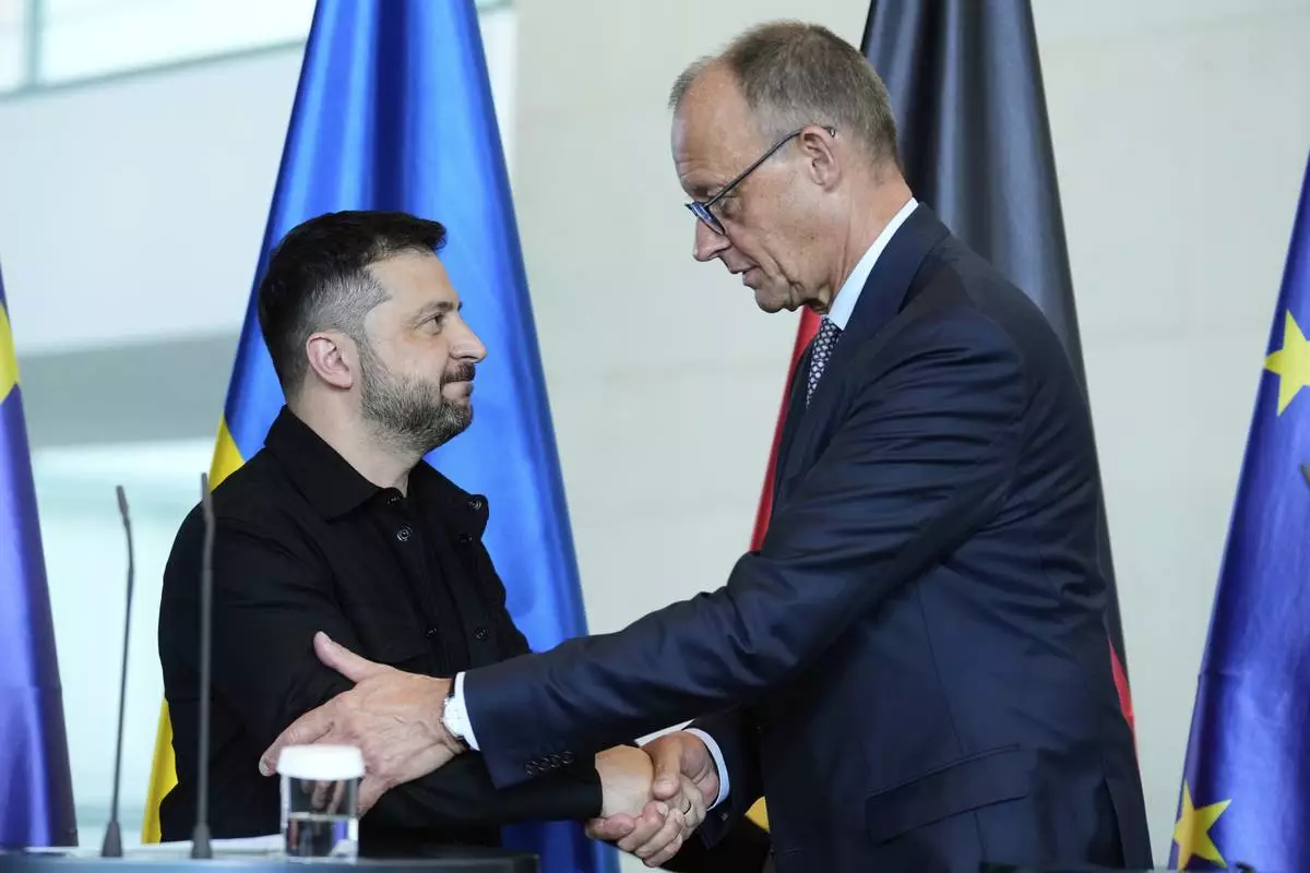 German Chancellor Friedrich Merz, right, and Ukrainian President Volodymyr Zelenskyy, left, shake hands after a joint press statement following talks with European and U.S. leaders in Berlin, Germany, Wednesday, Aug. 13, 2025. (AP Photo/Ebrahim Noroozi)