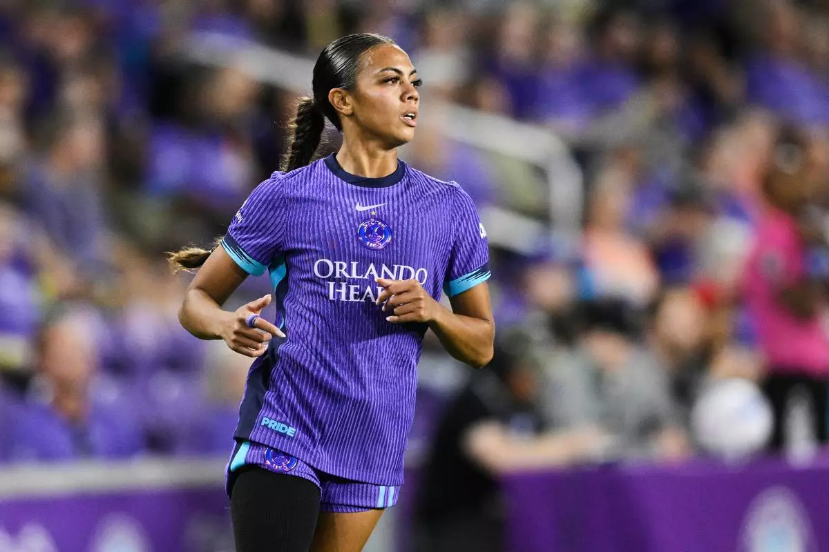 FILE - Orlando Pride forward Ally Watt follows a play during an NWSL soccer match against the Chicago Stars, Friday, March 14, 2025, in Orlando, Fla. (AP Photo/Phelan M. Ebenhack, File)
