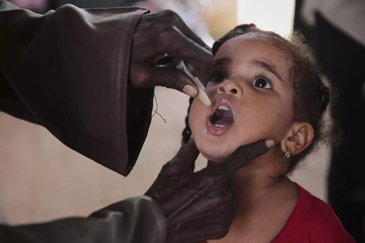 A Sudanese girl receives an oral cholera vaccine during a 10-day vaccination campaign conducted by health ministry workers in Khartoum, Sudan, Wednesday, Aug. 13, 2025. (AP Photo/Marwan Ali)