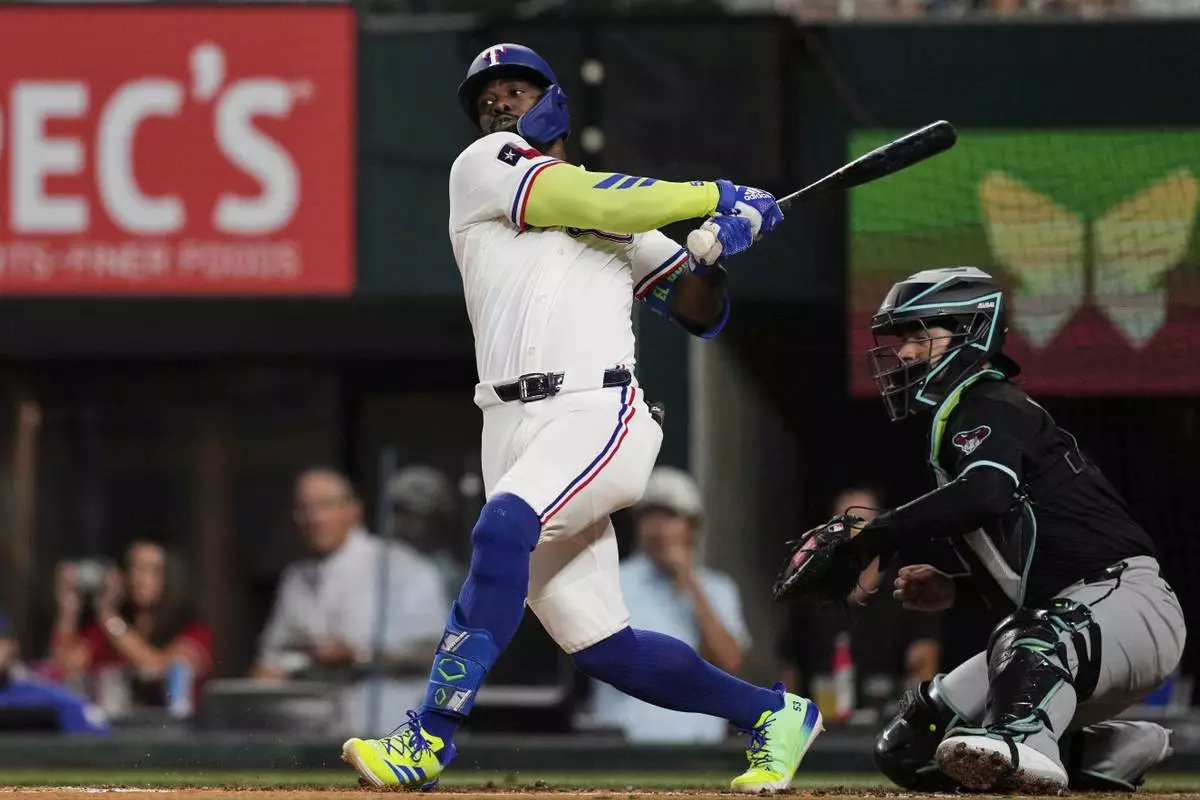 Texas Rangers' Adolis Garcia follows through on a run-scoring ground out as Arizona Diamondbacks' Jose Herrera, right, looks on in the second inning of a baseball game Tuesday, Aug. 12, 2025, in Arlington, Texas. (AP Photo/Tony Gutierrez)