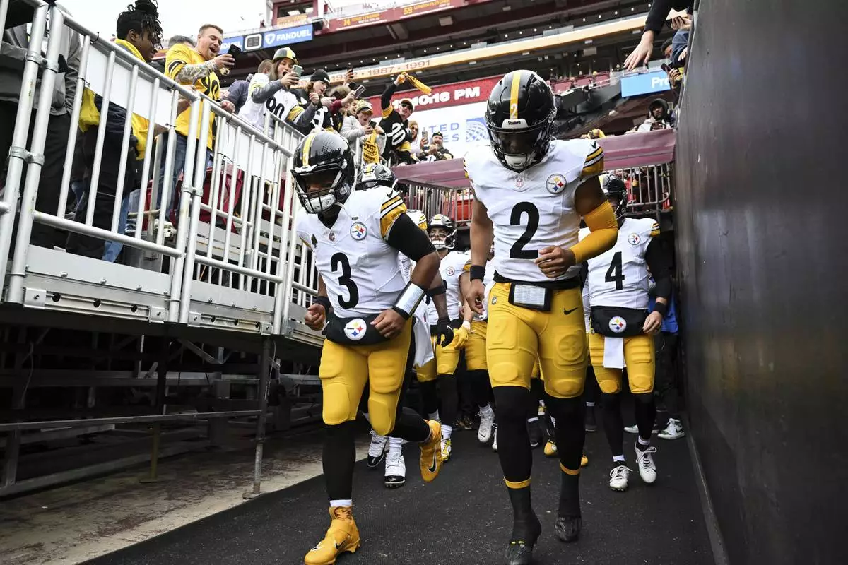 FILE - Pittsburgh Steelers quarterback Russell Wilson (3) and quarterback Justin Fields (2) lead there team onto the field before an NFL football game against the Washington Commanders, Sunday, Nov. 10, 2024, in Landover, Md. (AP Photo/Terrance Williams, file)