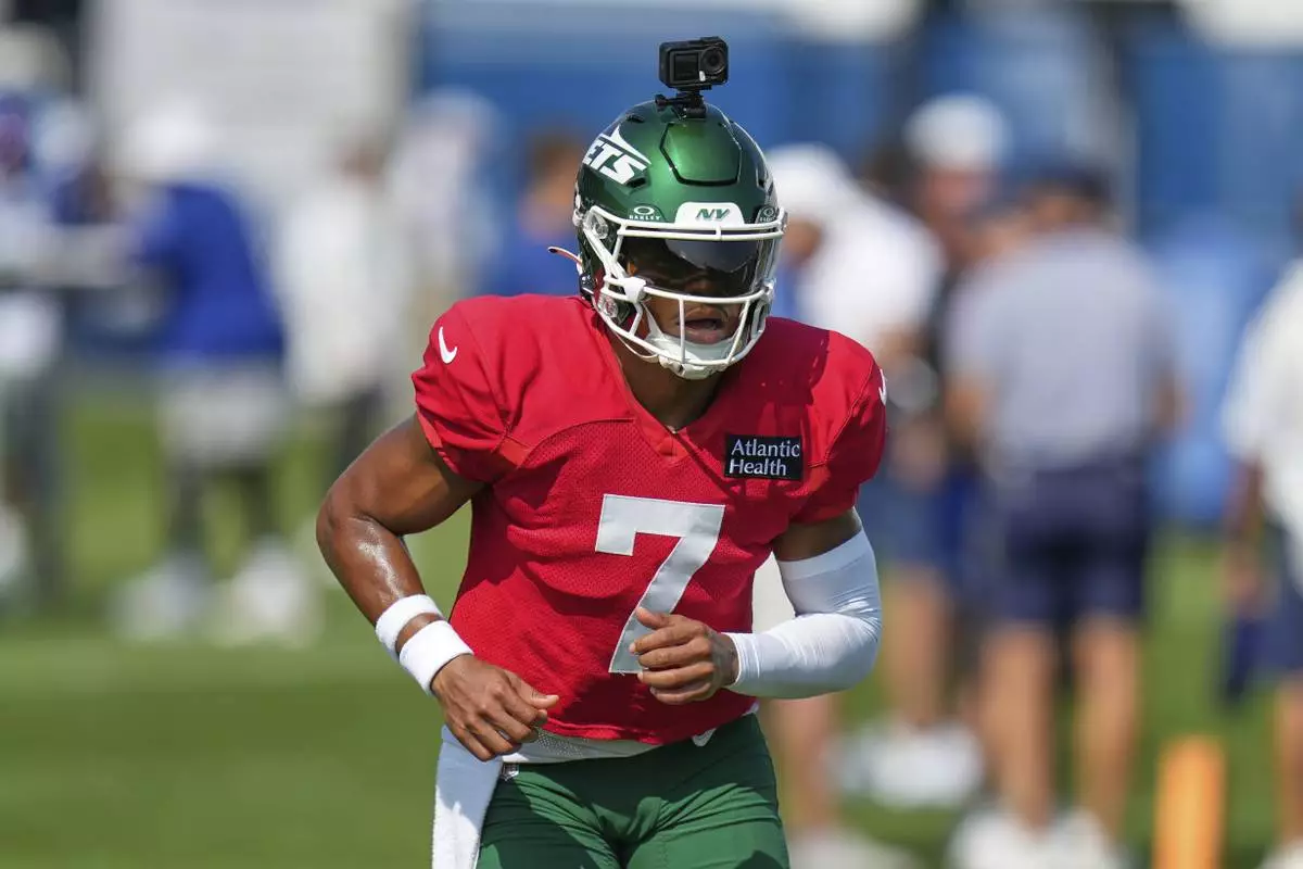 New York Jets' quarterback Justin Fields participates during a joint NFL football practice with the New York Giants in East Rutherford, N.J., Wednesday, Aug. 13, 2025. (AP Photo/Seth Wenig)