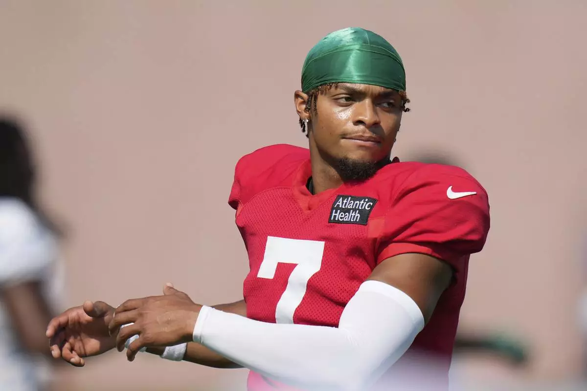 New York Jets' quarterback Justin Fields stretches during a joint NFL football practice with the New York Giants in East Rutherford, N.J., Wednesday, Aug. 13, 2025. (AP Photo/Seth Wenig)