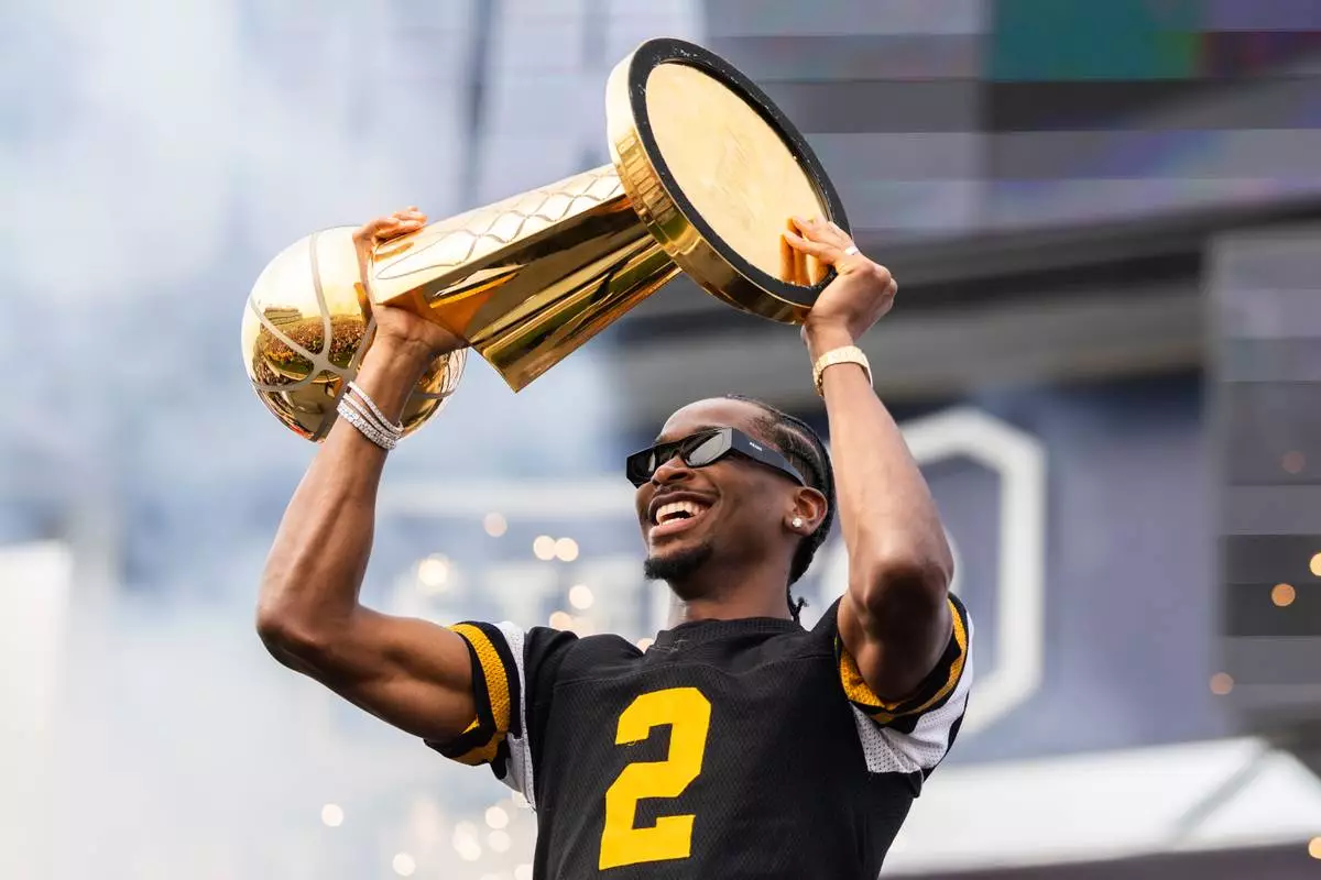 Oklahoma City Thunder's Shai Gilgeous-Alexander holds up the Larry O'Brien Trophy during a ceremony honoring the NBA basketball champion, Thursday, Aug. 7, 2025, in Hamilton, Ontario. (Nick Iwanyshyn/The Canadian Press via AP)