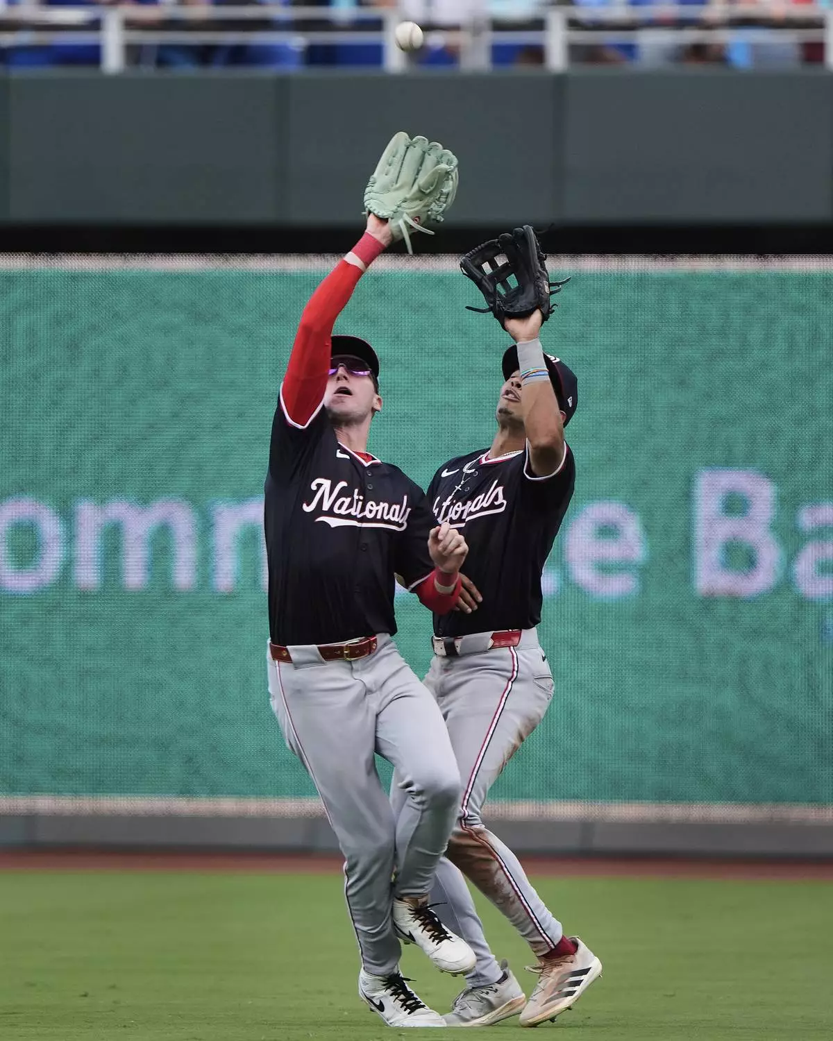 Washington Nationals center fielder Robert Hassell III, left, beats Daylen Lile to catch a one-run sacrifice fly hit by Kansas City Royals' Bobby Witt Jr. during the eighth inning of a baseball game Wednesday, Aug. 13, 2025, in Kansas City, Mo. (AP Photo/Charlie Riedel)