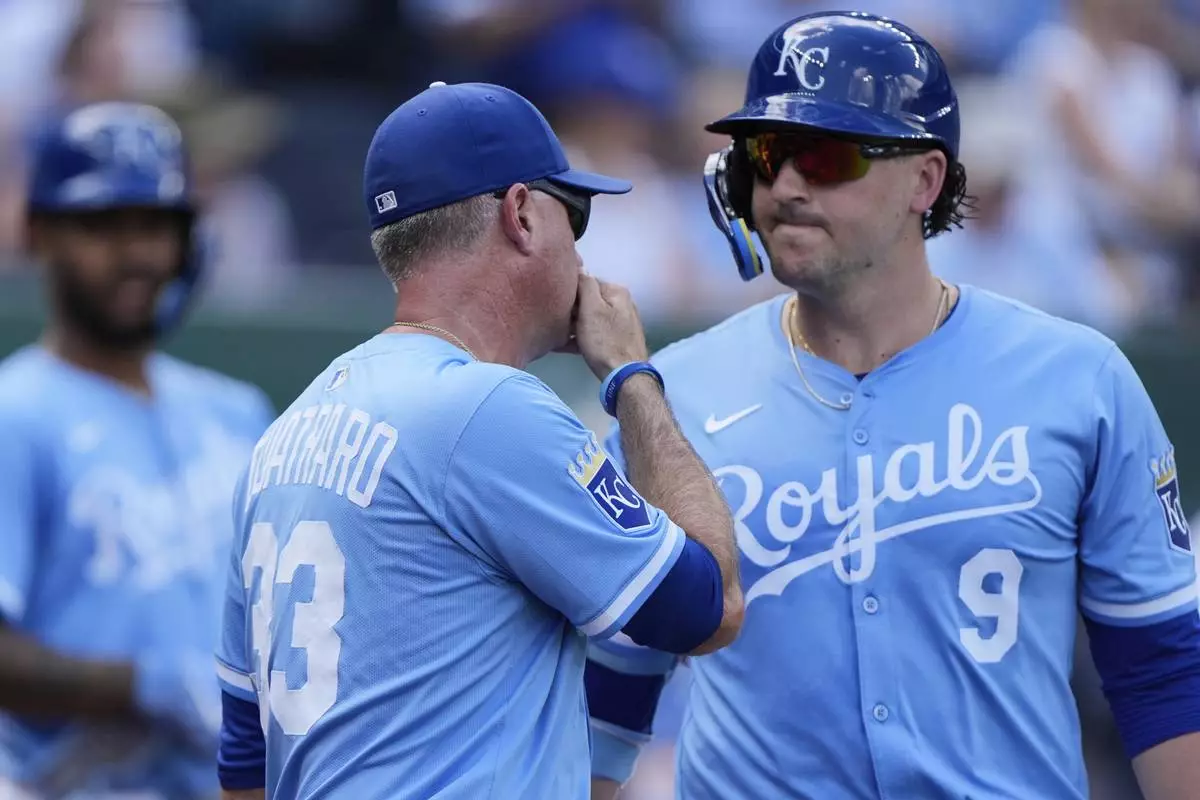 Kansas City Royals manager Matt Quatraro (33) talks to Vinnie Pasquantino (9) during the second inning of a baseball game against the Washington Nationals, Wednesday, Aug. 13, 2025, in Kansas City, Mo. (AP Photo/Charlie Riedel)