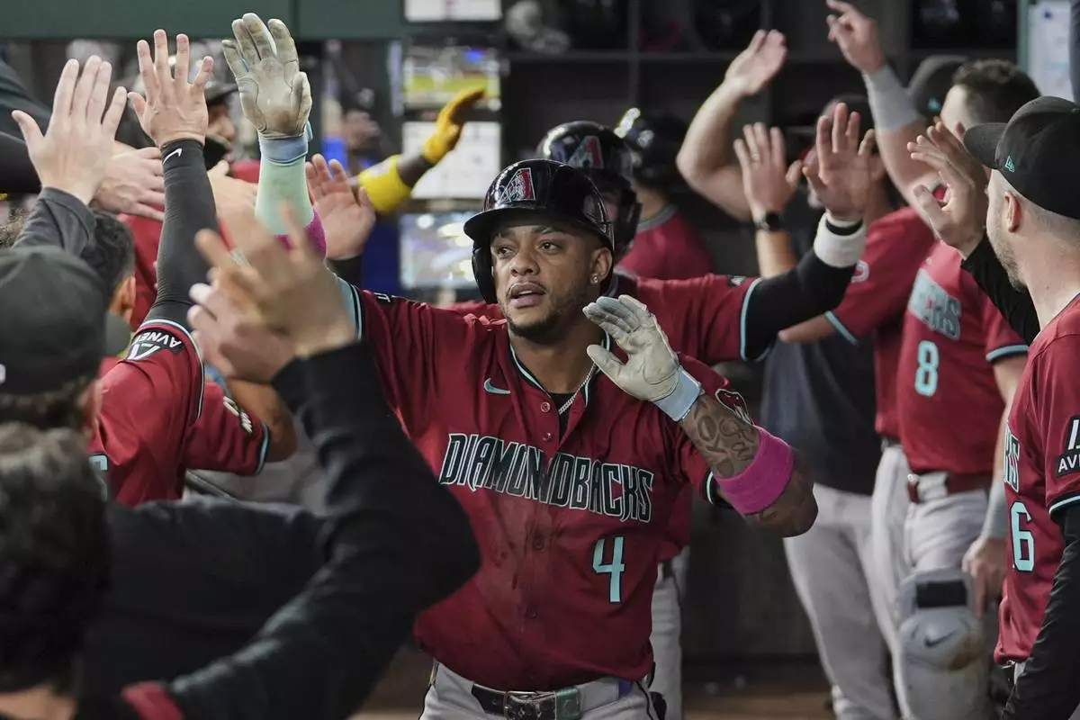 Arizona Diamondbacks' Geraldo Perdomo celebrates with the team after scoring on a Ketel Marte single in the third inning of a baseball game against the Texas Rangers Wednesday, Aug. 13, 2025, in Arlington, Texas. (AP Photo/Tony Gutierrez)