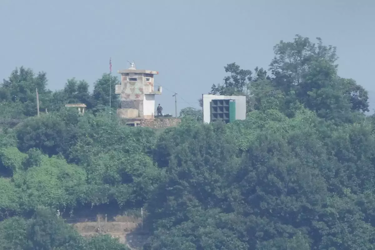A North Korean military guard post, left, and loudspeaker are seen from Paju, South Korea, near the border with North Korea, Sunday, Aug. 10, 2025. (AP Photo/Ahn Young-joon)
