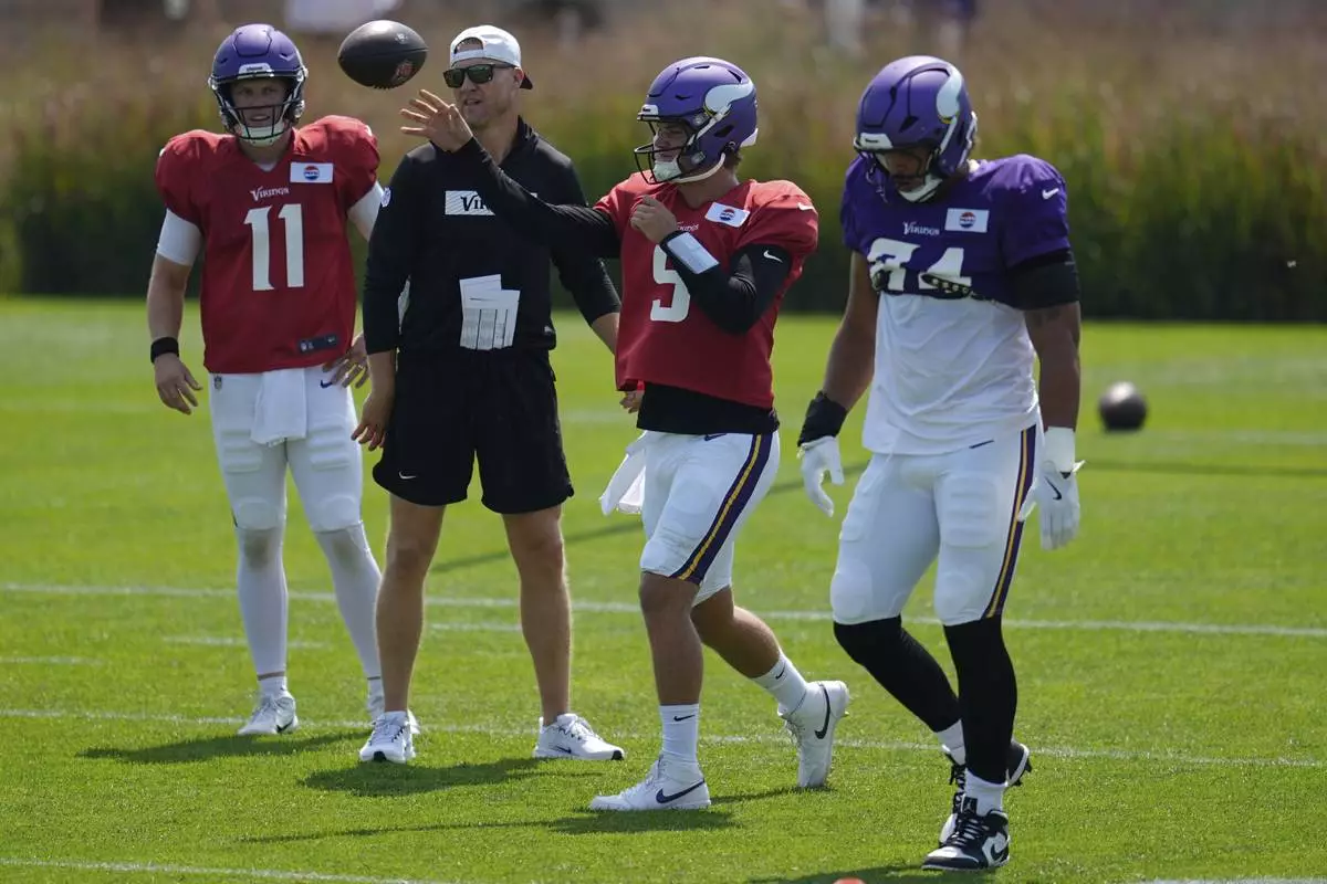 Minnesota Vikings quarterback J.J. McCarthy (9) takes part in drills during a joint NFL football training camp with the New England Patriots, Wednesday, Aug. 13, 2025, in Eagan, Minn. (AP Photo/Abbie Parr)