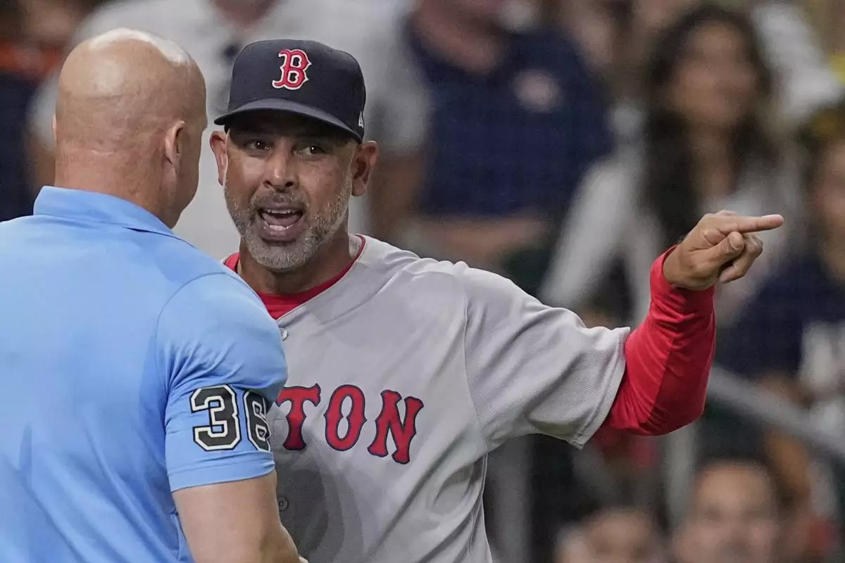 Boston Red Sox manager Alex Cora, right, argues with home plate umpire Ryan Blakney (36) after being ejected during the seventh inning of a baseball game against the Houston Astros Wednesday, Aug. 13, 2025, in Houston. (AP Photo/David J. Phillip)