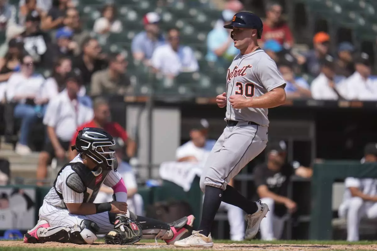 Detroit Tigers' Kerry Carpenter (30) jogs by Chicago White Sox catcher Edgar Quero (7) to score on a sacrifice fly by Wenceel Pérez during the sixth inning of a baseball game Wednesday, Aug. 13, 2025, in Chicago. (AP Photo/Erin Hooley)