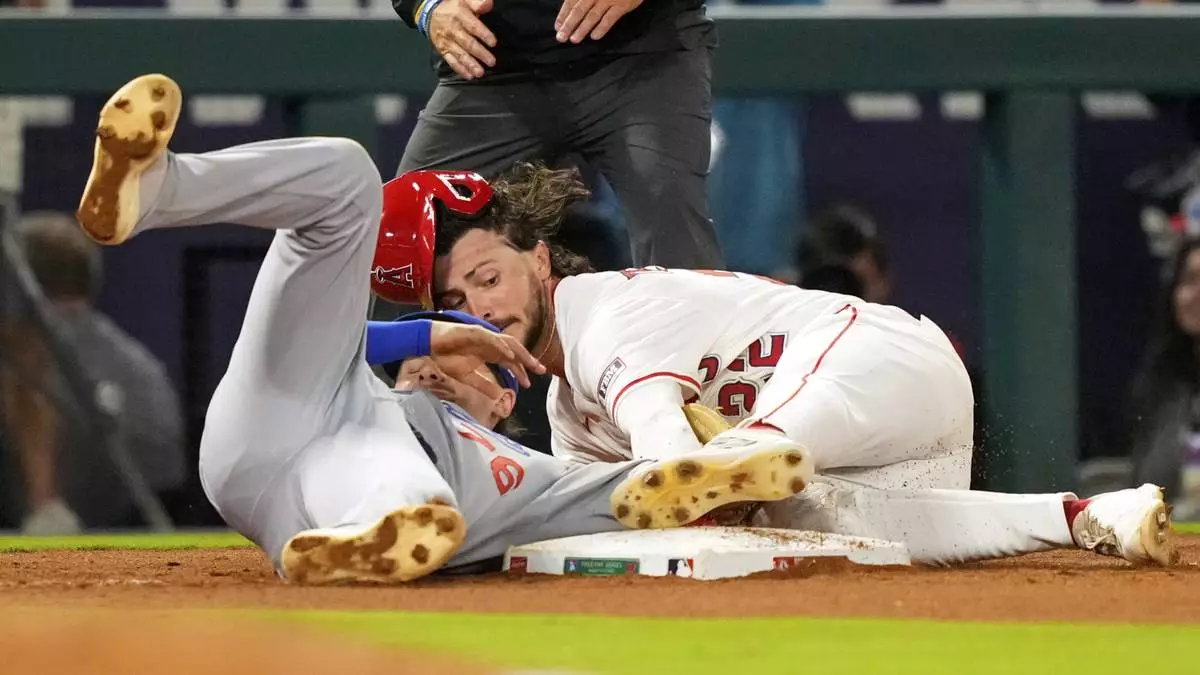 Los Angeles Angels' Bryce Teodosio, right, is tagged out by Los Angeles Dodgers third baseman Alex Freeland as he tries to steal third during the seventh inning of a baseball game Wednesday, Aug. 13, 2025, in Anaheim, Calif. (AP Photo/Mark J. Terrill)