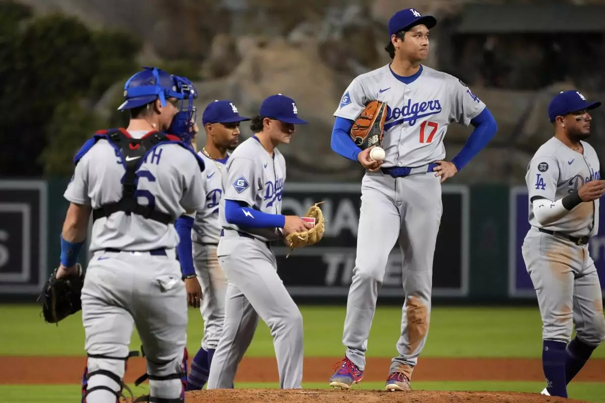 Los Angeles Dodgers starting pitcher Shohei Ohtani, second from right, waits to be taken out of the game throws to the plate during the fifth inning of a baseball game against the Los Angeles Angels, Wednesday, Aug. 13, 2025, in Anaheim, Calif. (AP Photo/Mark J. Terrill)