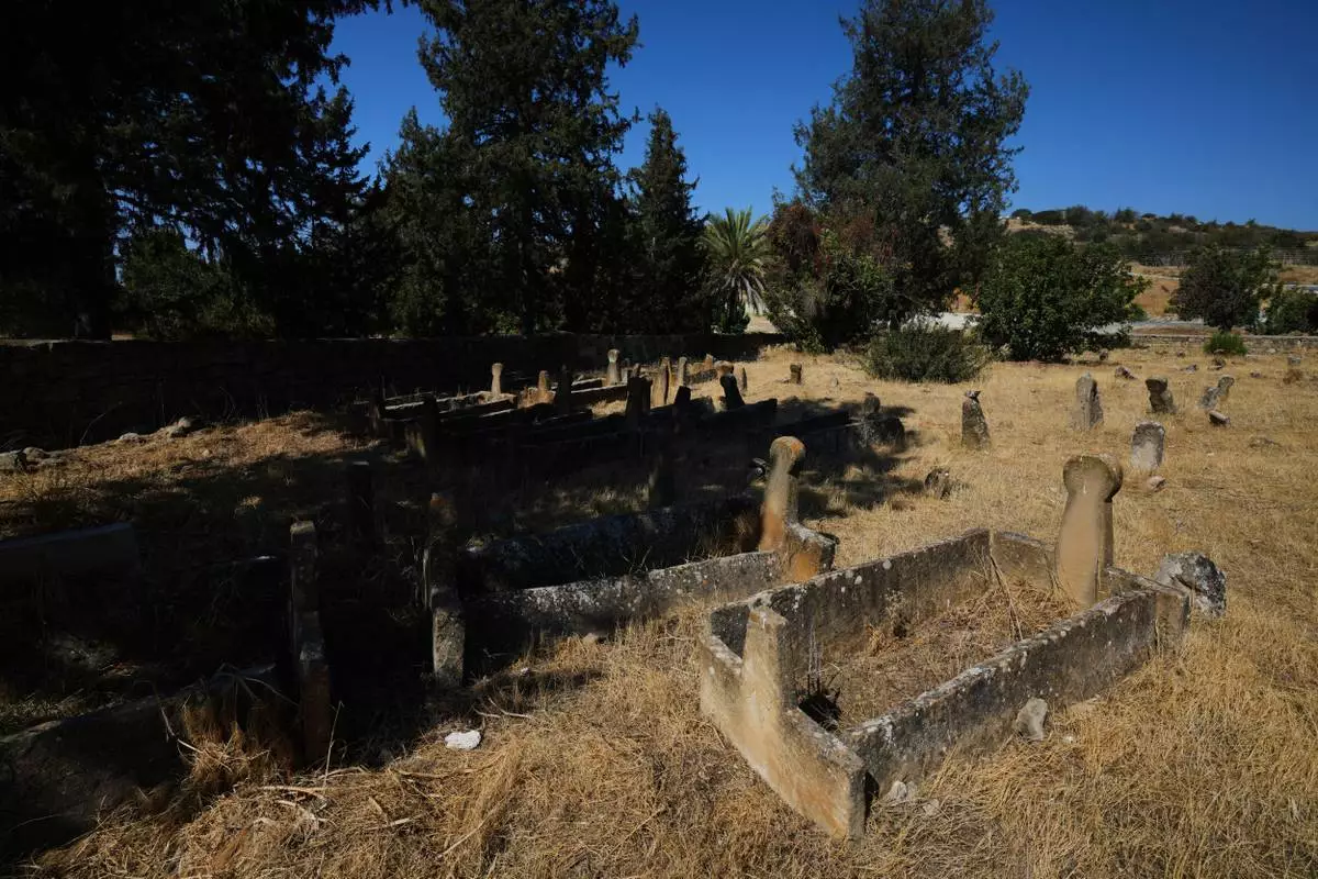 CORRECTS DATE - Shade from pine trees covers some of the graves of Turkish Cypriots at the Muslim cemetery in the village of Tochni, Cyprus on July 3, 2025. (AP Photo/Petros Karadjias)