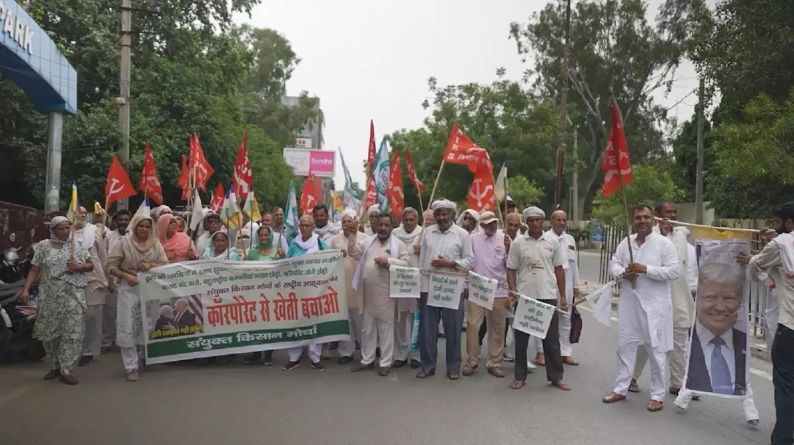 Hundreds of protesters demanded India to reject tariff threats and assert its right to trade freely with all countries. The farmers and farm workers sent a clear message to the government: India must push back against U.S. pressure.