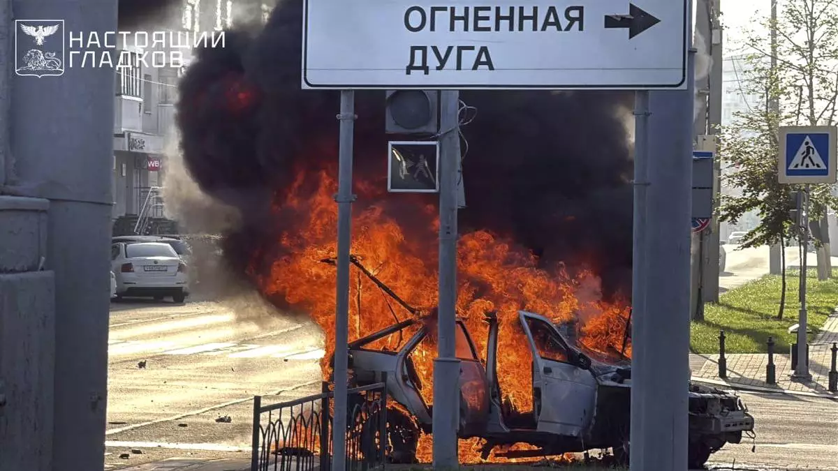 In this photo, released by Belgorod regional governor Vyacheslav Gladkov's Telegram channel on Thursday, Aug. 14, 2025, flames rise from a burning car in a street after a drone attack by the Armed Forces of Ukraine on the city of Belgorod. (Belgorod Region Governor Vyacheslav Gladkov Telegram channel via AP)