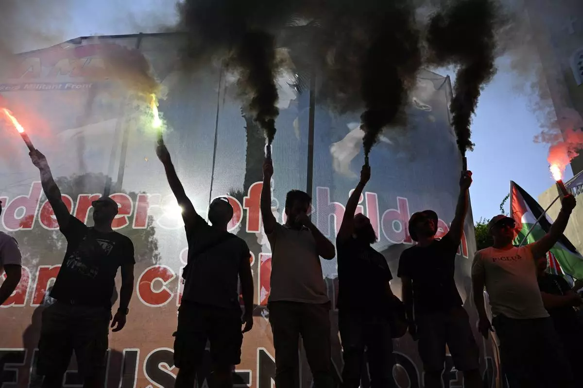 At the port of Piraeus, near Athens, demonstrators held flares and waved Palestinian flags behind a cordon formed with riot police buses.