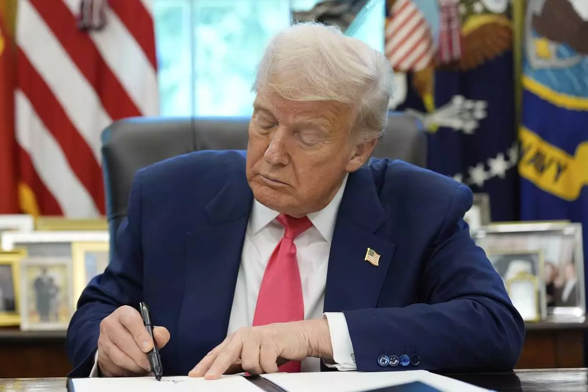 President Donald Trump signs a proclamation in the Oval Office honoring the 90th anniversary of the Social Security Act, Thursday, Aug. 14, 2025, in Washington. (AP Photo/Alex Brandon)