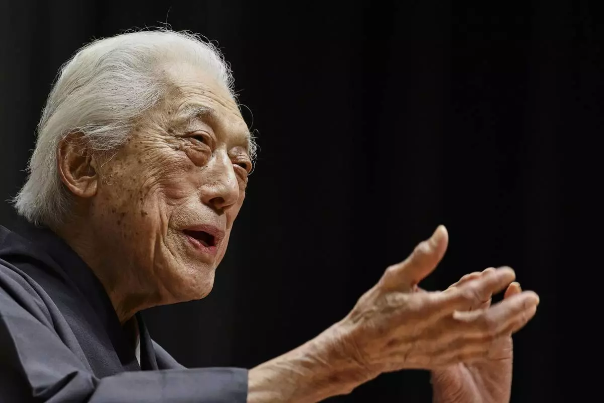 Genshitsu Sen, a grand master of the Urasenke school of Japanese tea ceremony, speaks at a news conference in Osaka, western Japan, in April 2023. (Kyodo News via AP)