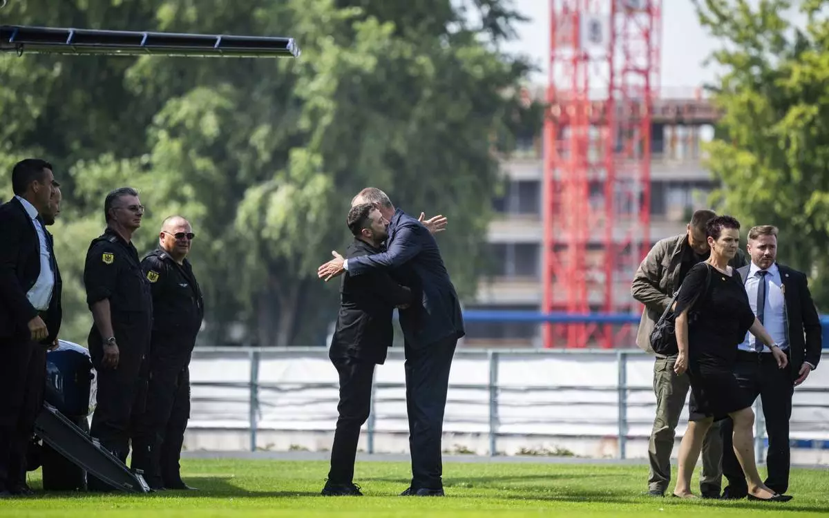 Ukrainian President Volodymyr Zelenskyy, center left, is welcomed by German Chancellor Friedrich Merz upon arrival in the garden of the chancellery in Berlin, Germany, Wednesday, Aug. 13, 2025 to join a video conference of European leaders with the U.S. President on the Ukraine war. (John MacDougall/Pool Photo via AP)