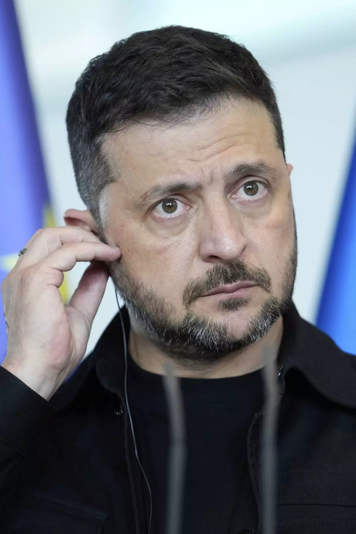 Ukrainian President Volodymyr Zelenskyy attends a joint press statement with German Chancellor Friedrich Merz following talks with European and U.S. leaders in Berlin, Germany, Wednesday, Aug. 13, 2025. (AP Photo/Ebrahim Noroozi)