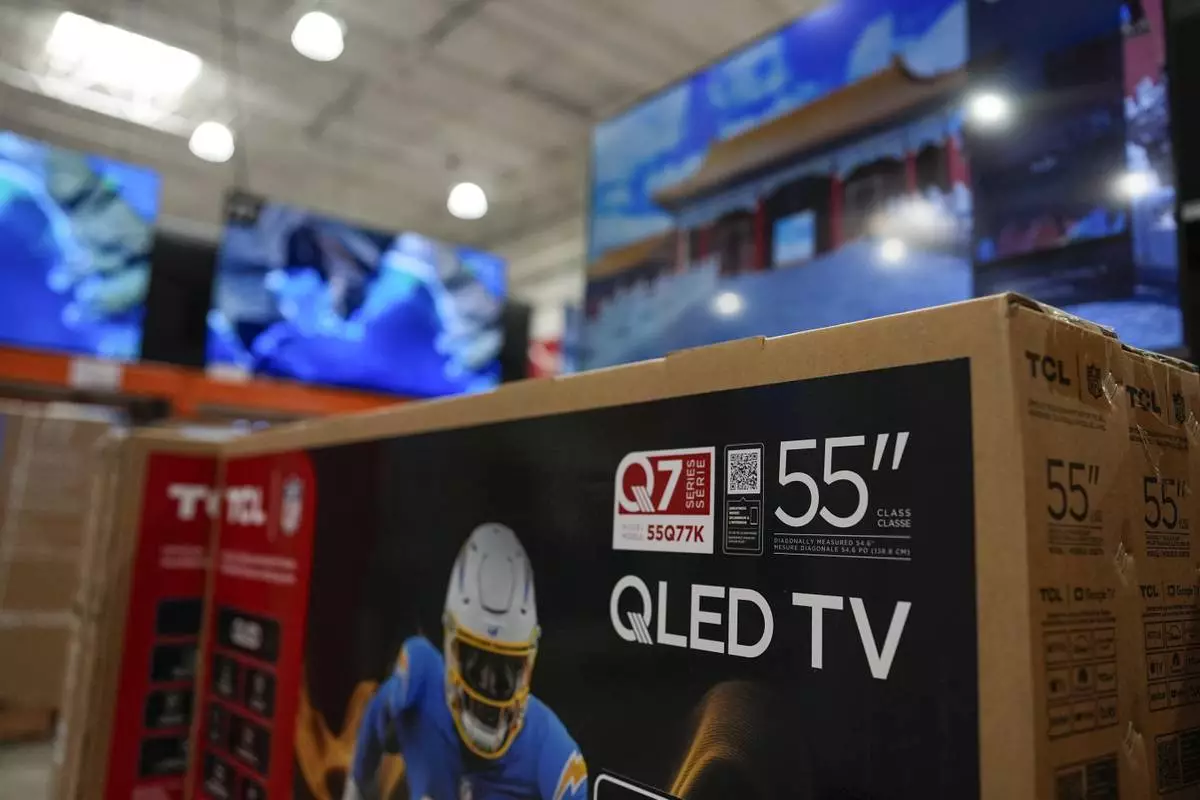New televisions are displayed for sale at a store in Kennesaw, Ga., on Thursday, Aug. 14, 2025. (AP Photo/Mike Stewart)