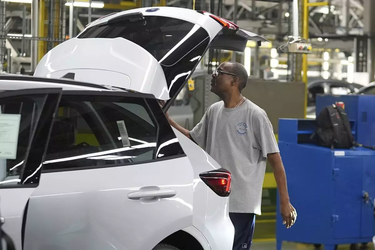 A Ford vehicle is shown on the assembly line at the Ford Louisville Assembly Plant, Monday, Aug. 11, 2025, in Louisville, Ky. (AP Photo/Darron Cummings)